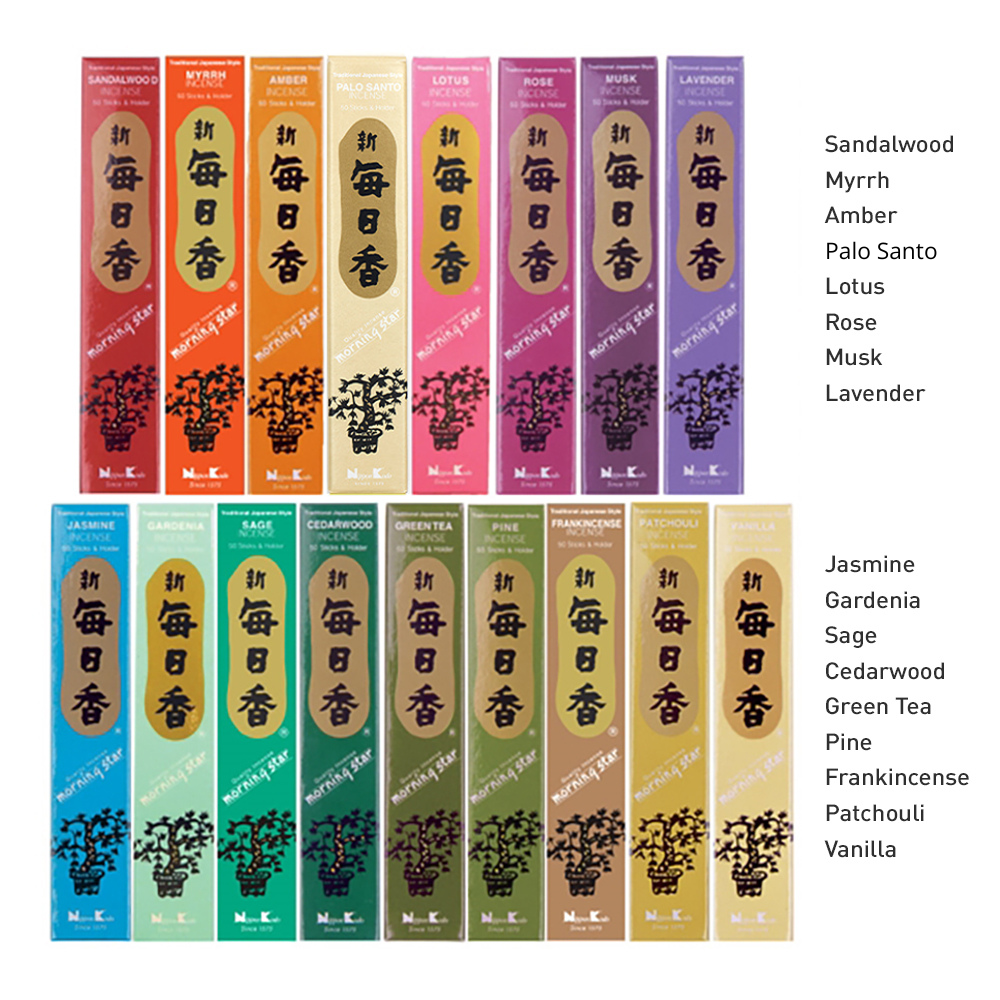 The best-selling incense for daily use. Morning Star incense was created in the 1960s in Japan. It has been loved for over 60 years not only by the Japanese but people all over the world. The powerful fragrances in this collection mixed with high quality ingredients such as pure floral essences and aromatic woods, have made this incense a beloved and trusted worldwide brand. Morning Star is perfect for when you want to create a relaxing atmosphere for meditation, prayer, and yoga.