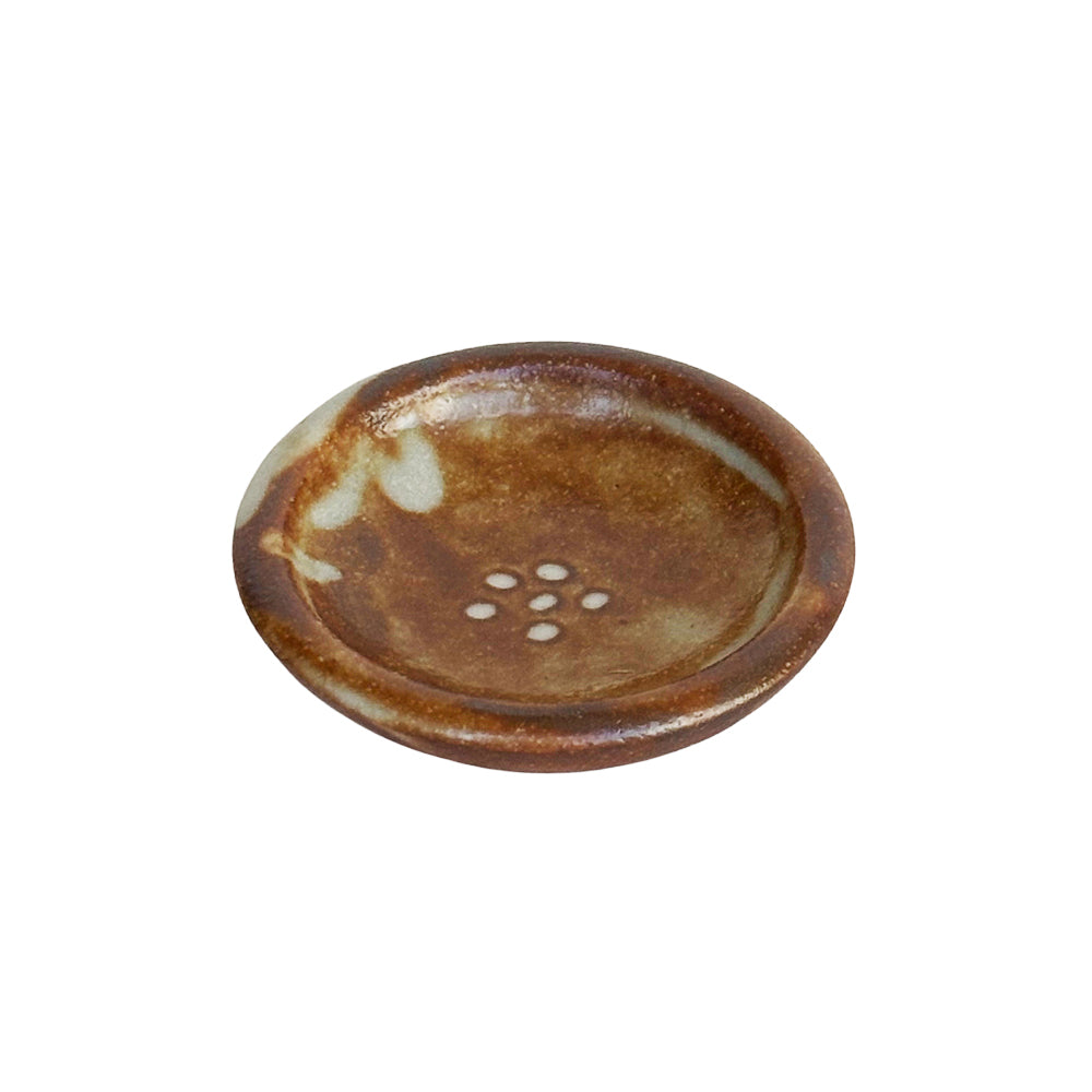 A hand-crafted, round incense plate, with a slightly curved up rim to help to catch ash. Plate has a brownish color with specs for accent. To use in accompaniment with an incense holder.